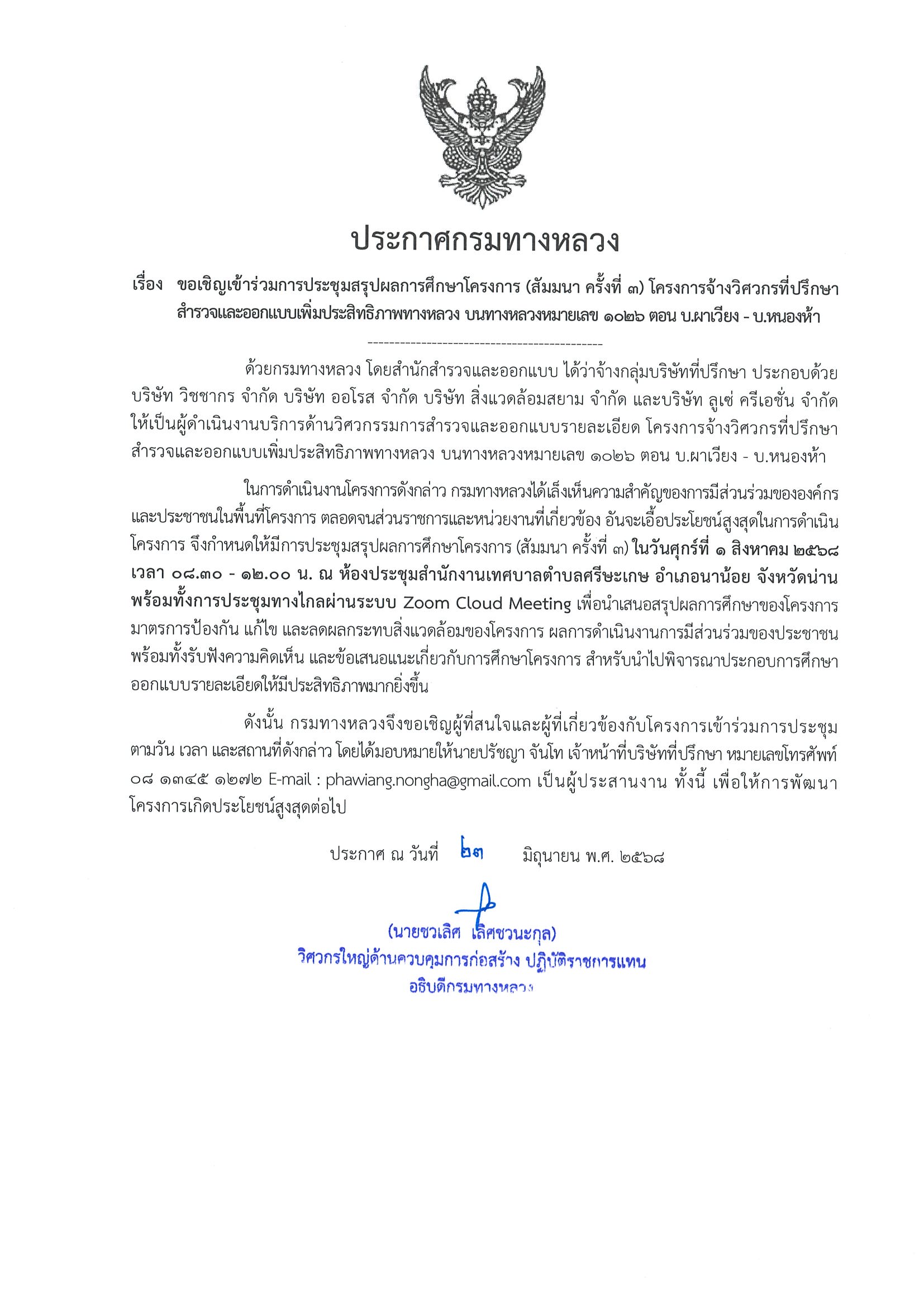 โครงการจ้างวิศวกรที่ปรึกษาสำรวจและออกแบบเพิ่มประสิทธิภาพทางหลวง